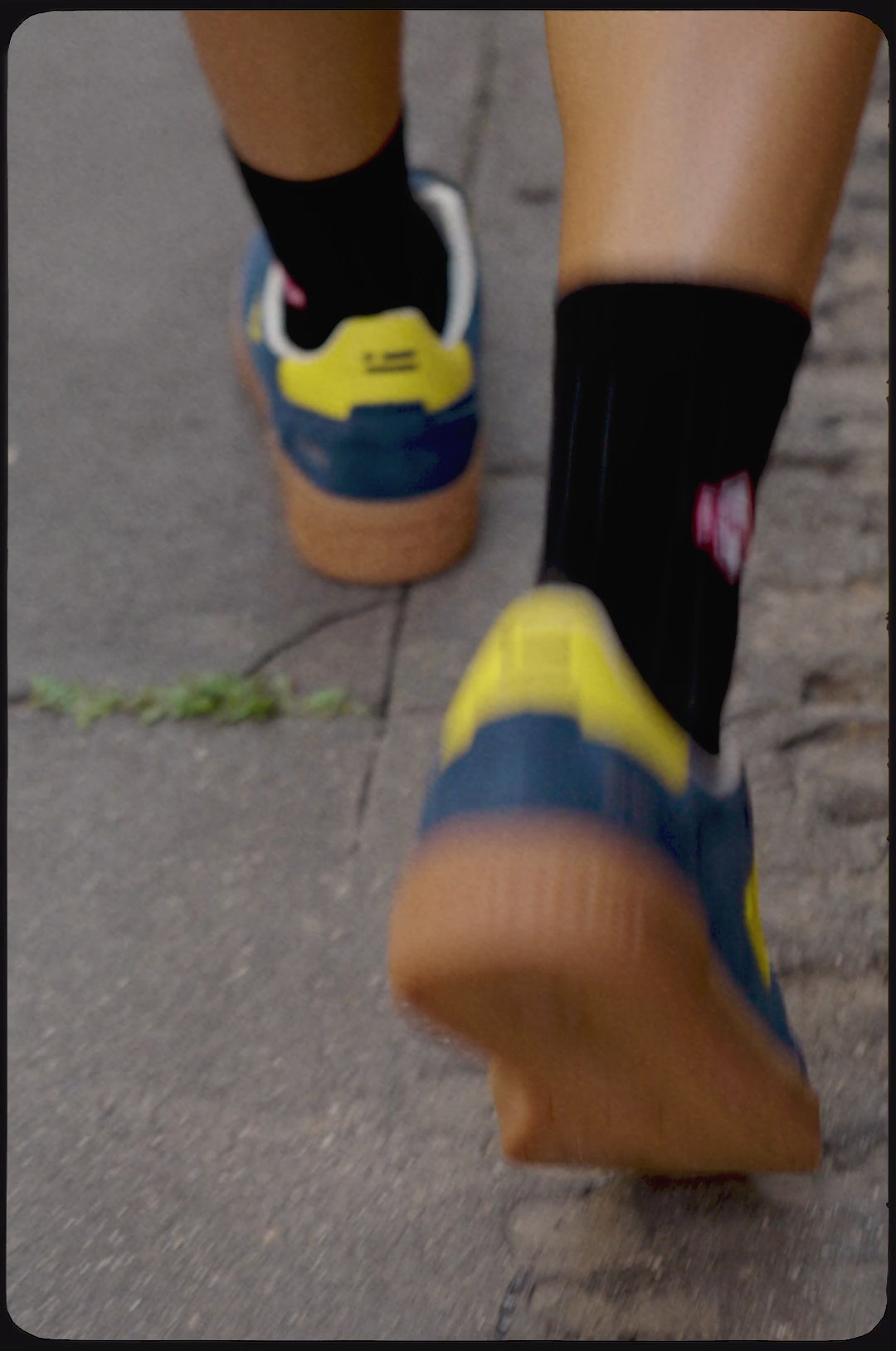 La Rebel D.Franklin presenta una silhouette bassa in blu e giallo. Presenta una selezione di dettagli che ne definiscono l'essenza. Presenta un logo in rilievo sia sul tallone che sulla suola, una bandiera ricamata sul lato e il nome del design sul retro. La suola in gomma di 2 cm offre un'aderenza e una trazione superiori.
