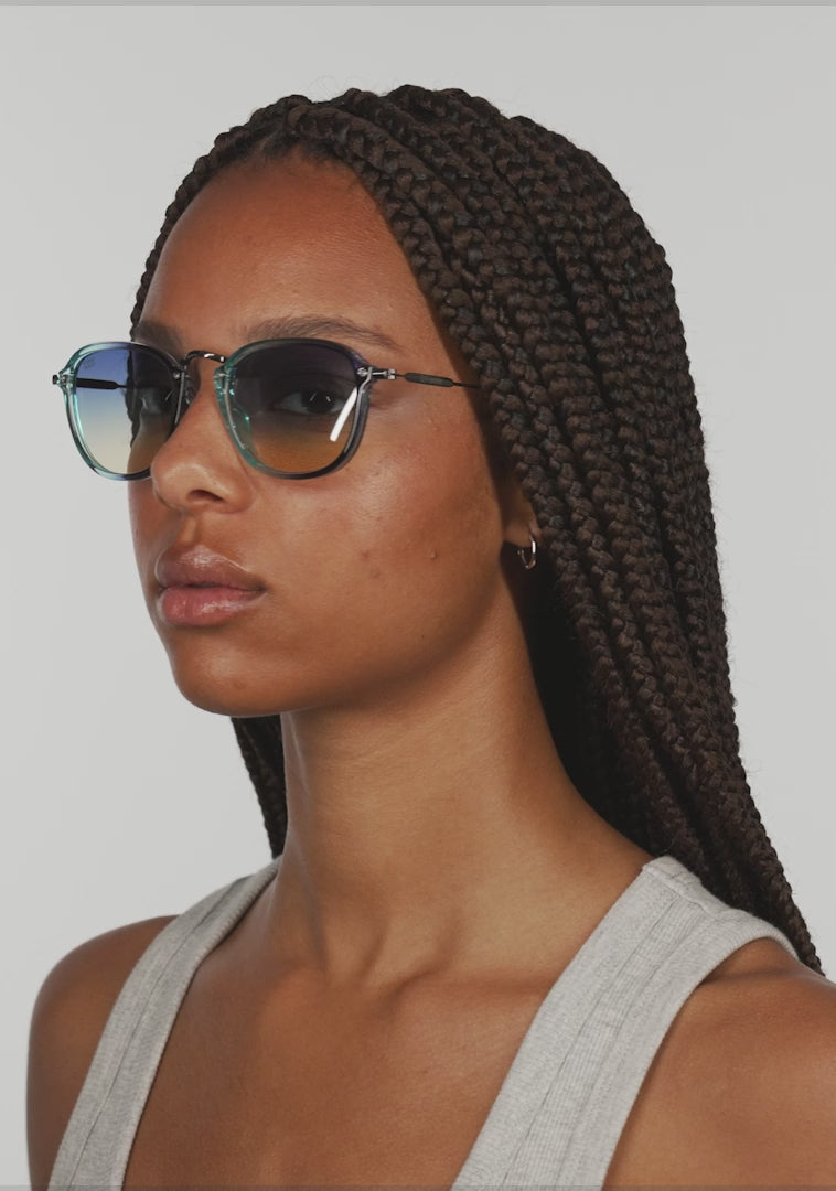 Le lenti in policarbonato presentano una sfumatura blu fumé su una silhouette quadrata in metallo. Presentano i dettagli caratteristici del nostro marchio: il logo inciso su entrambe le aste in metallo e il nostro emblema sulla lente destra. Con un'ampiezza delle lenti di 51 mm e una montatura anteriore di 147 mm, questi occhiali esaltano i tratti di qualsiasi viso. Le aste laterali sono in acciaio inossidabile e hanno una lunghezza di 145 mm.