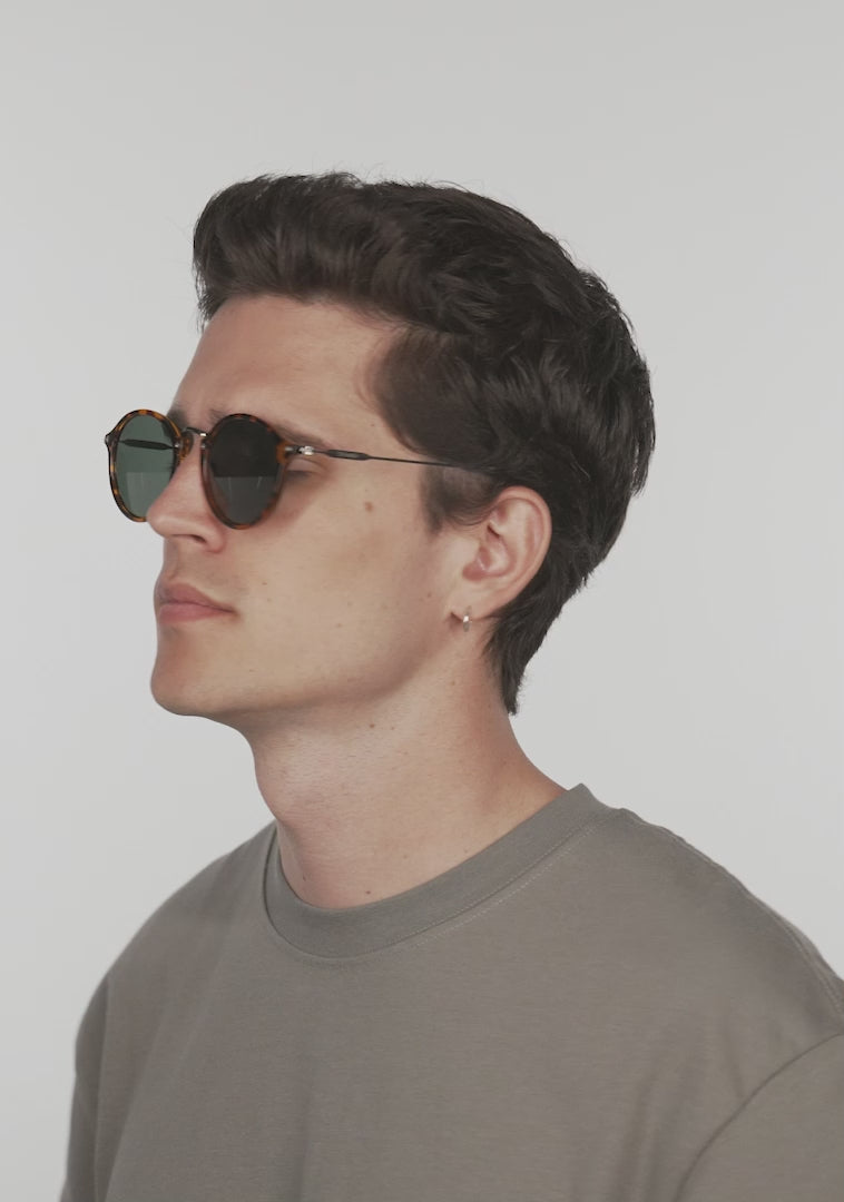 Le lenti arrotondate colorate di verde e la montatura tartarugata rafforzano l'estetica anni Settanta. Presenta i nostri caratteristici dettagli D.Franklin: il logo inciso su entrambe le aste in metallo e il nostro emblema sulla lente destra. Con una lente di 49 mm e una montatura di 148 mm, questi occhiali si adattano alla maggior parte dei visi. Le aste laterali sono lunghe 145 mm.